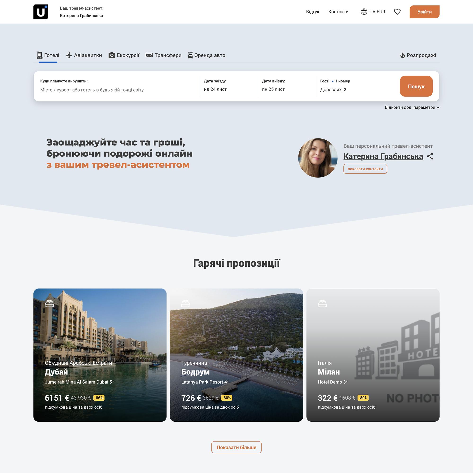 Одразу після реєстрації у сервісі бронювання Unit.Travel турагент безкоштовно отримує веб-сайт з адресою «назва агенції».unit.travel.